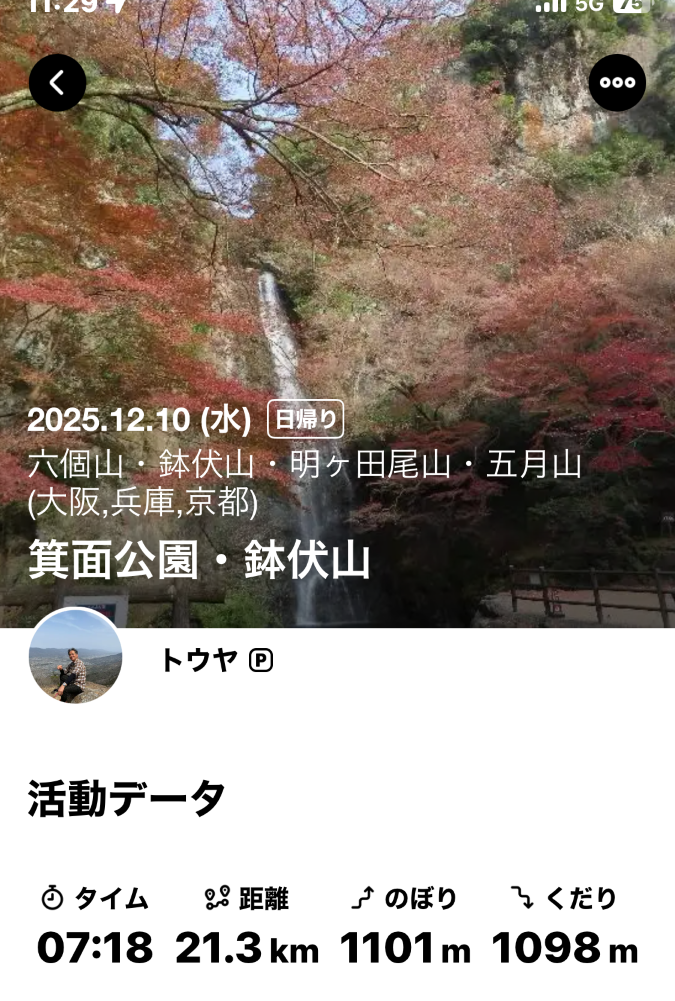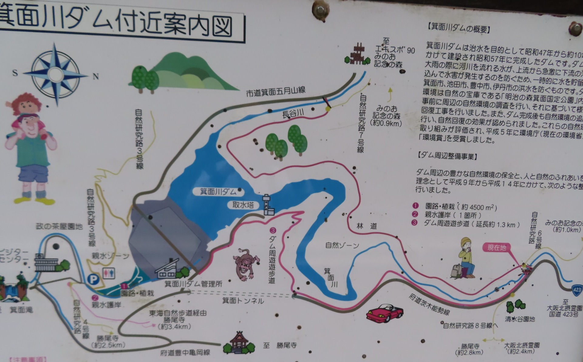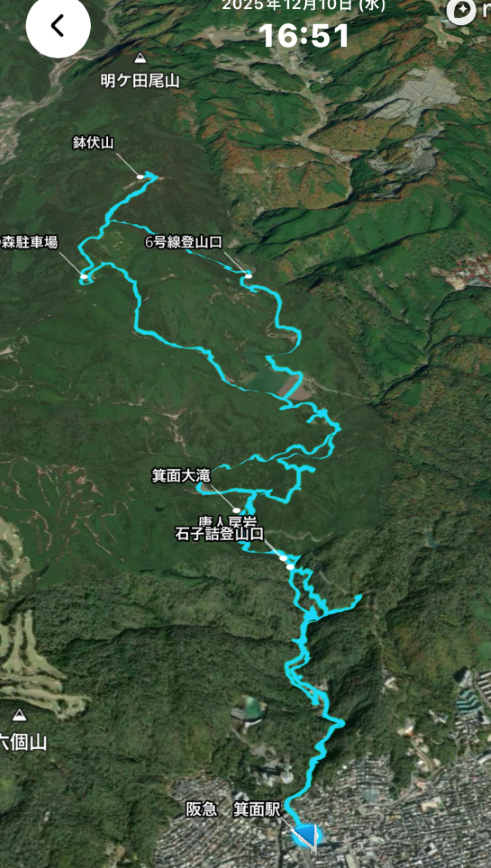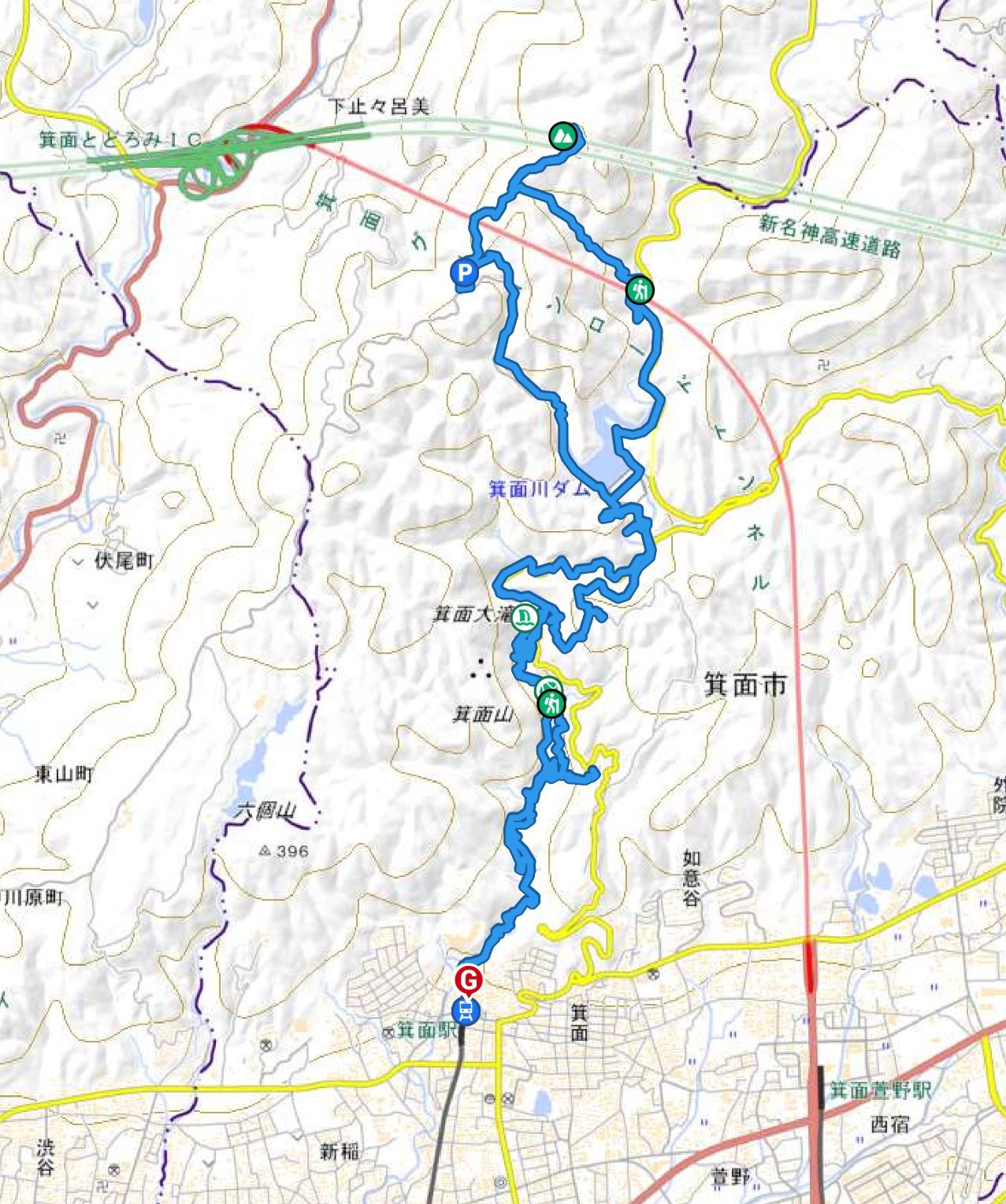 箕面駅→箕面公園→箕面ダム→鉢伏山→みのお記念の森→箕面駅
