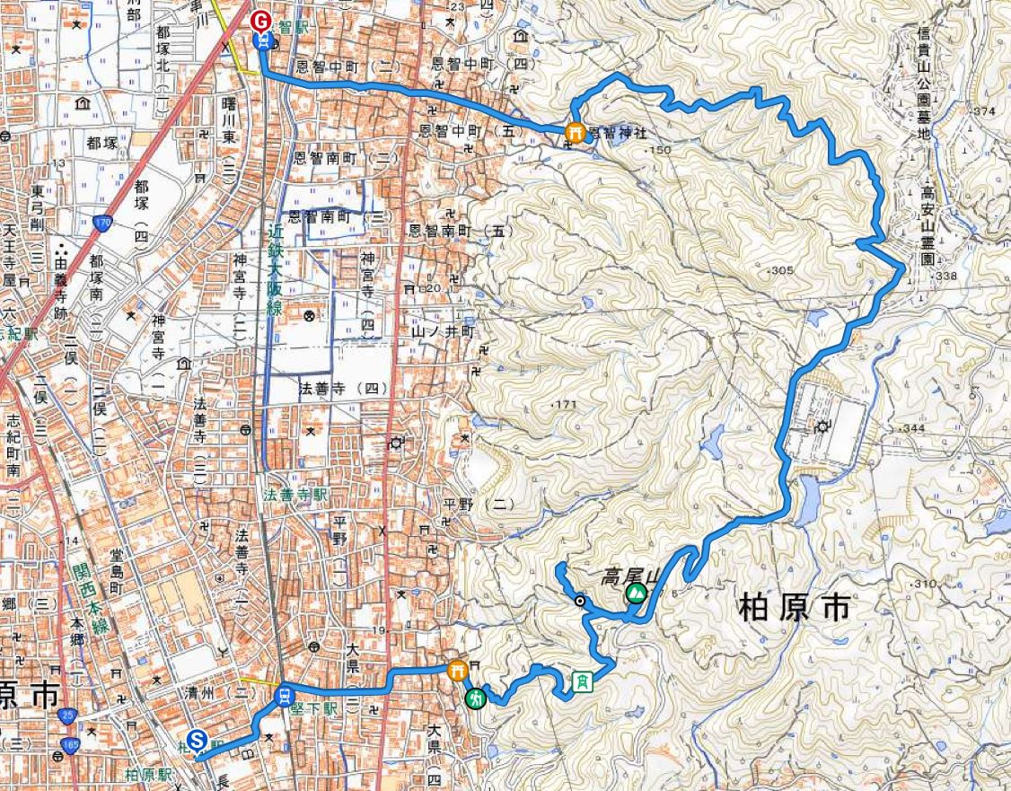 柏原駅→鐸比古神社→柏原水仙郷→高尾山→恩智神社→恩智駅