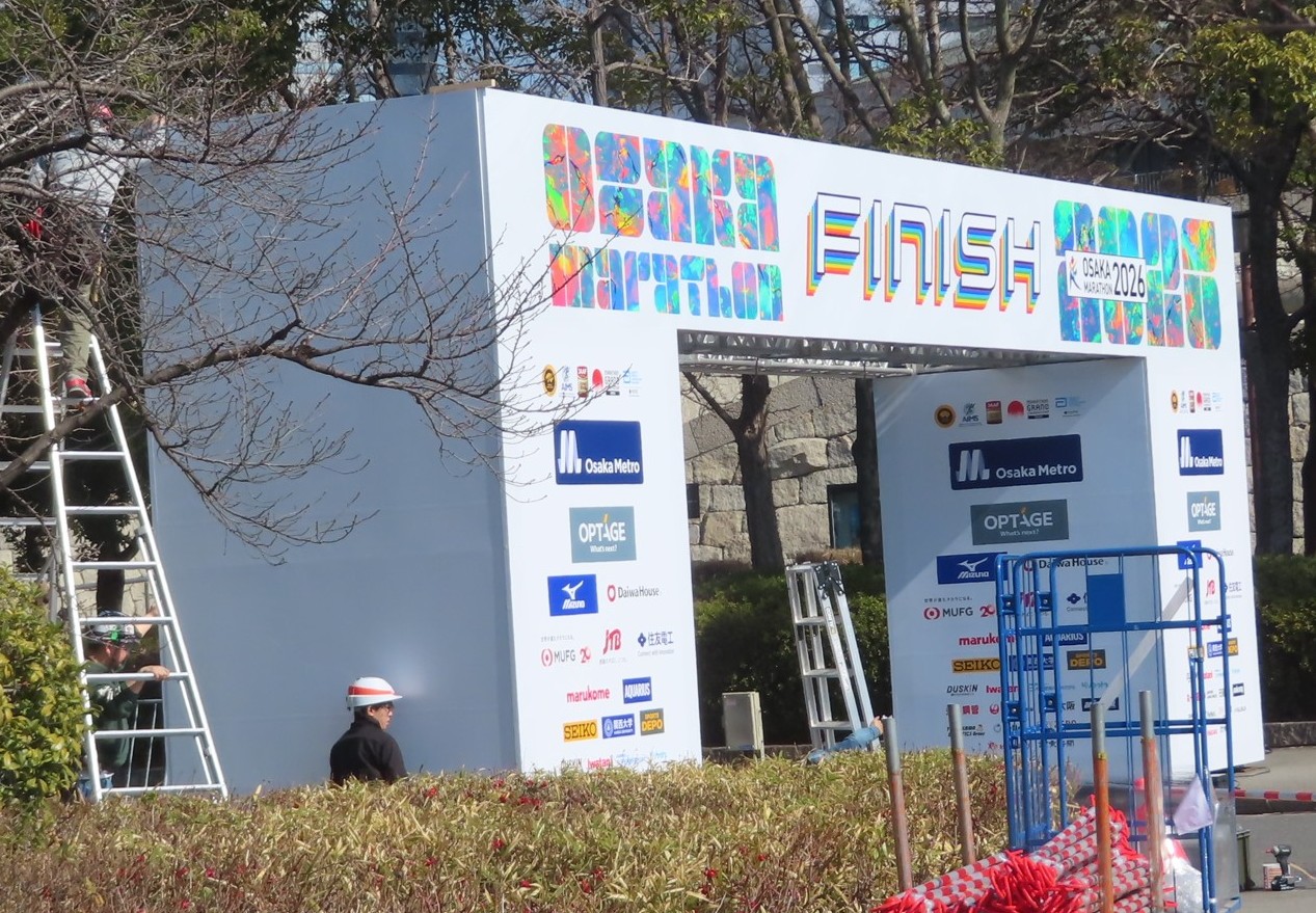 側では大阪マラソンの準備中でFINIShの門が設営されていました。