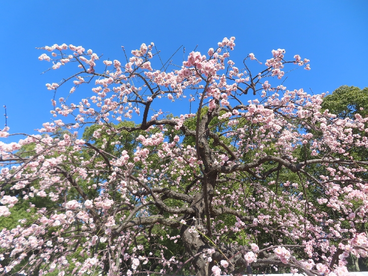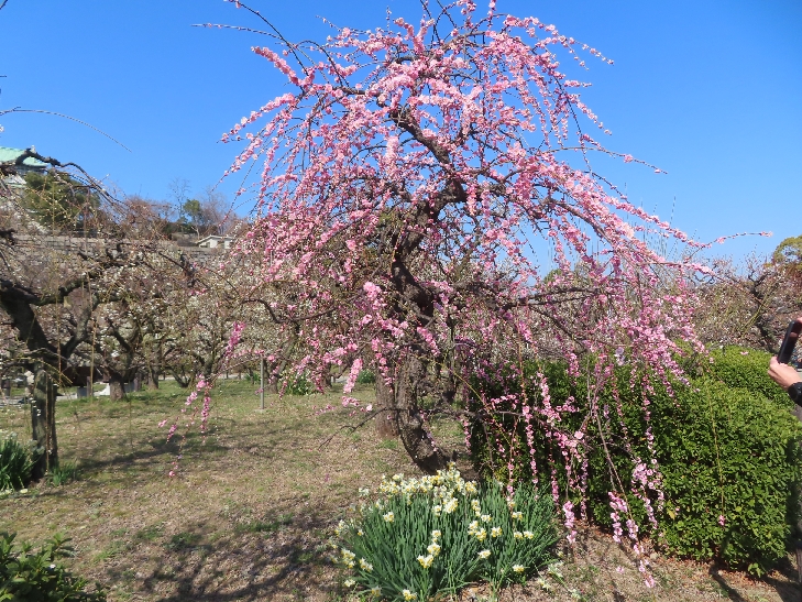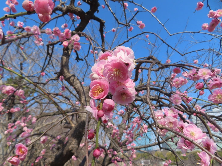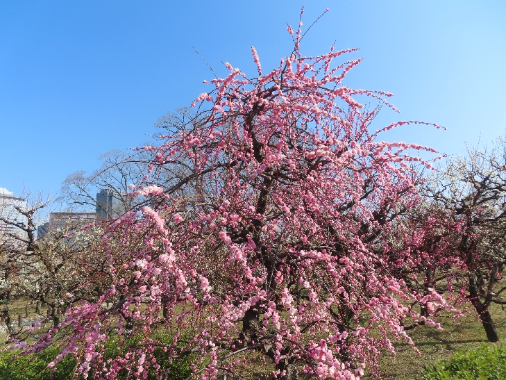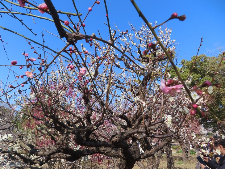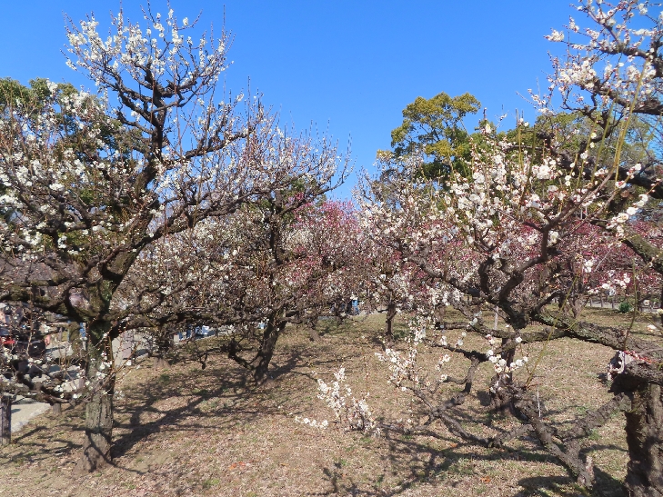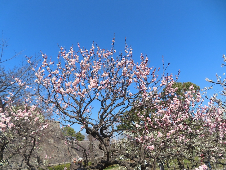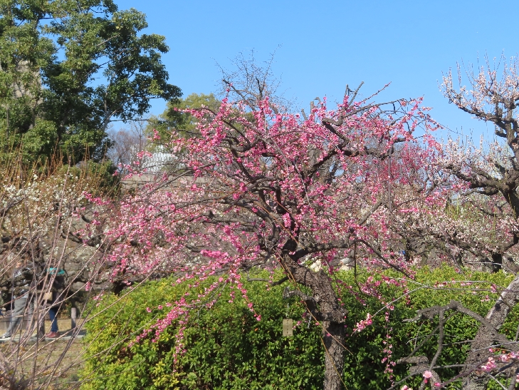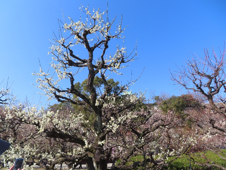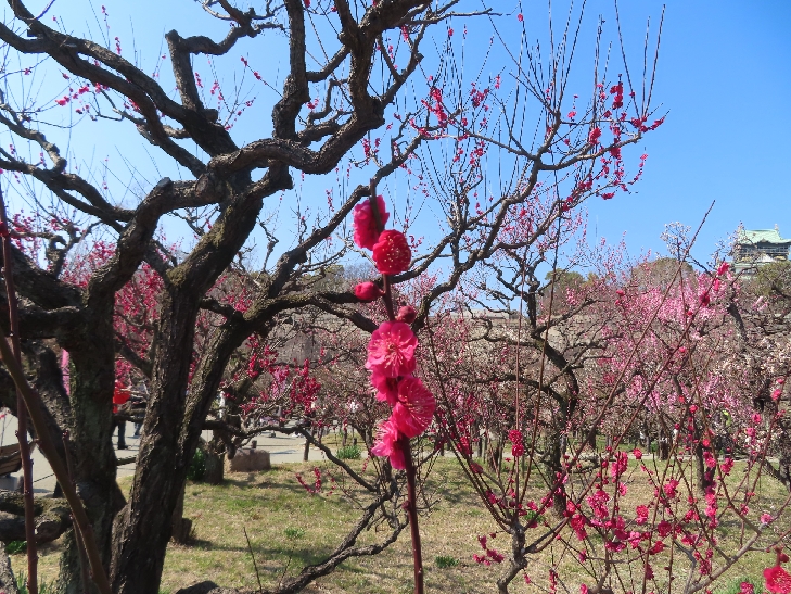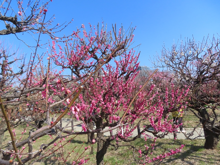 105品種、1,245本の梅が植わっていて 色とりどりの花をつけて青空と大阪城を背景に圧巻でした。