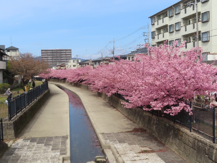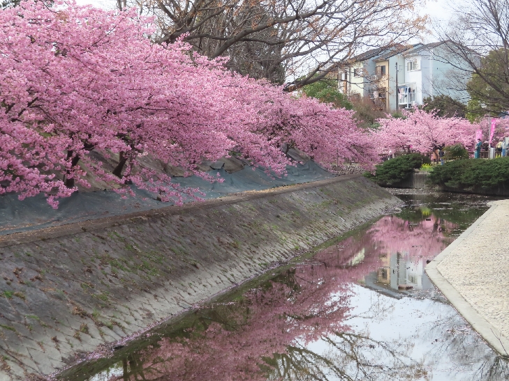 約300本もの河津桜が約1.3km淀水路沿いに続いていて圧巻です。