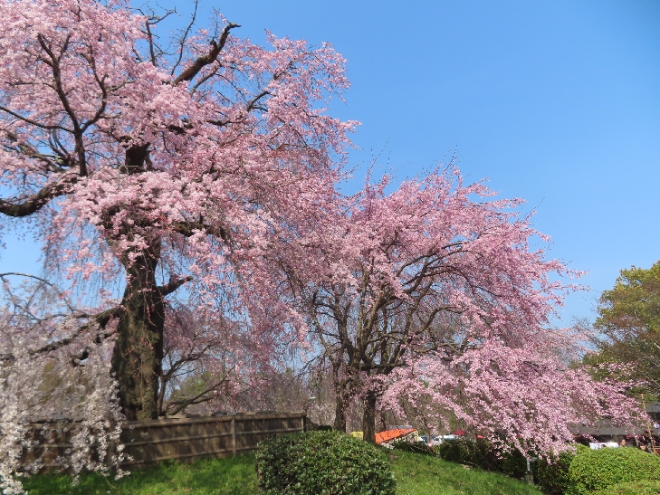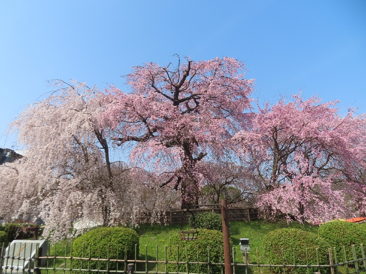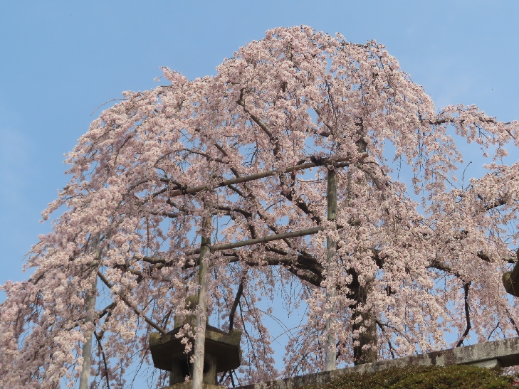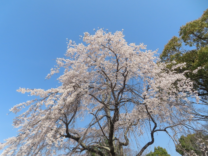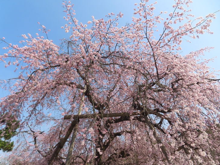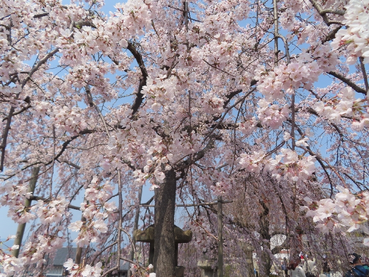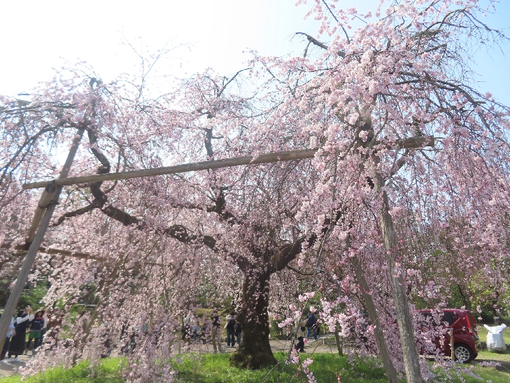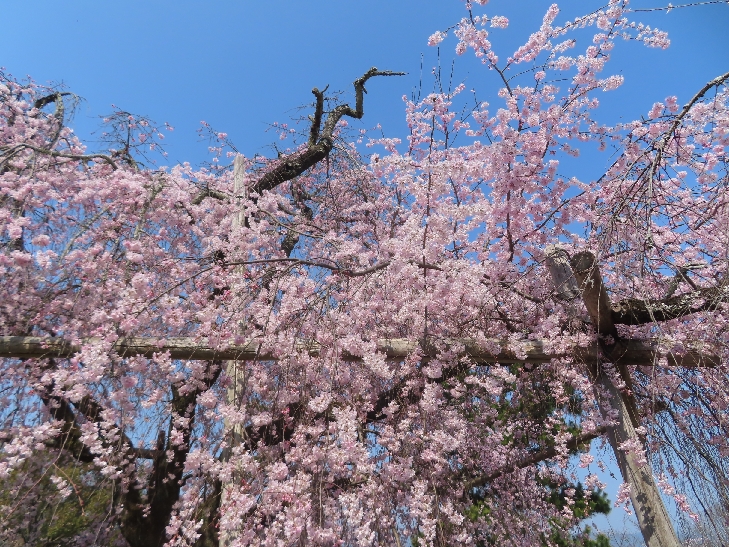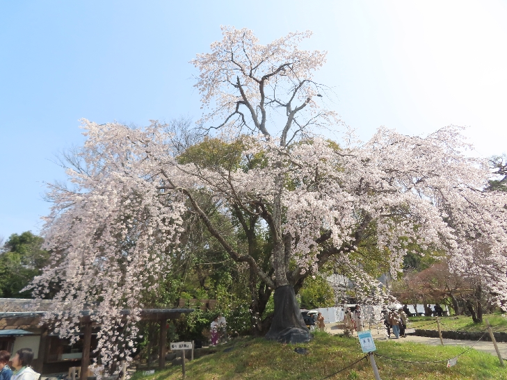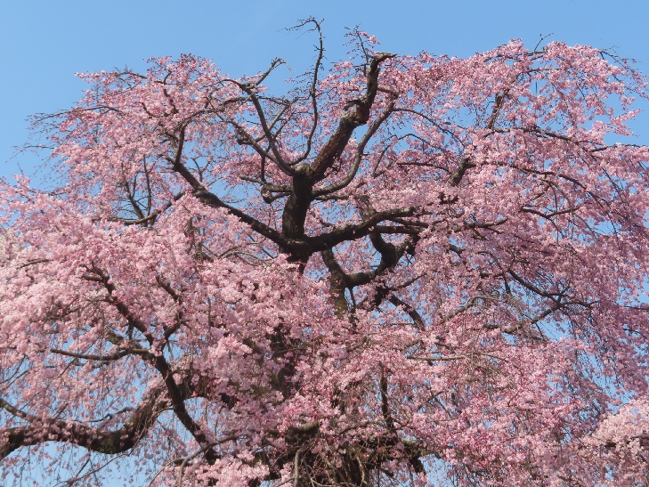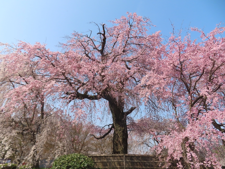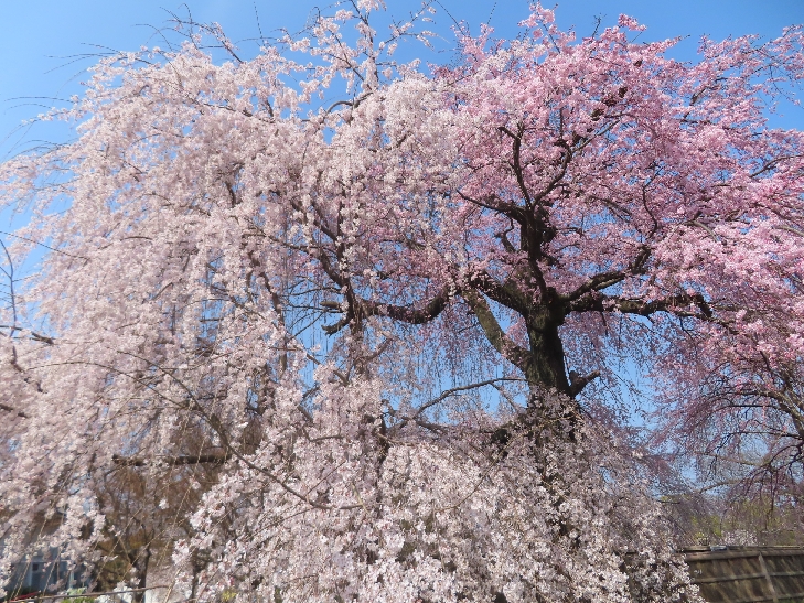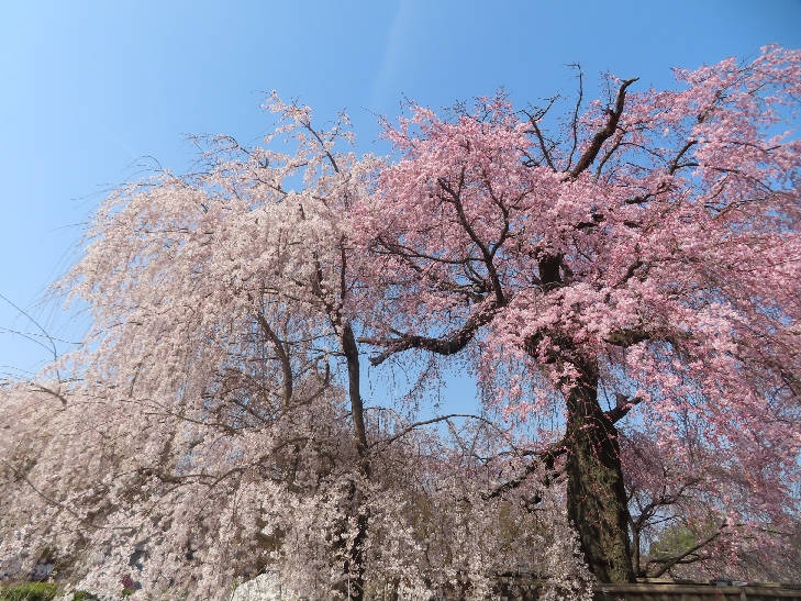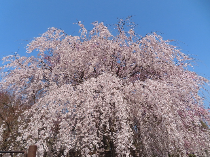 樹齢90年ほどの祇園枝垂れ桜「一重白彼岸枝垂桜」が満開で空から降ってくるようで壮観です。
