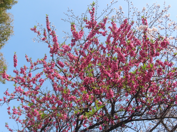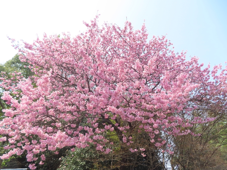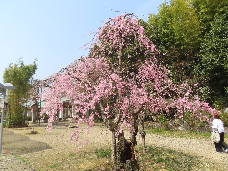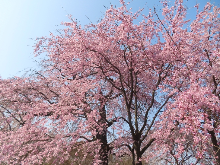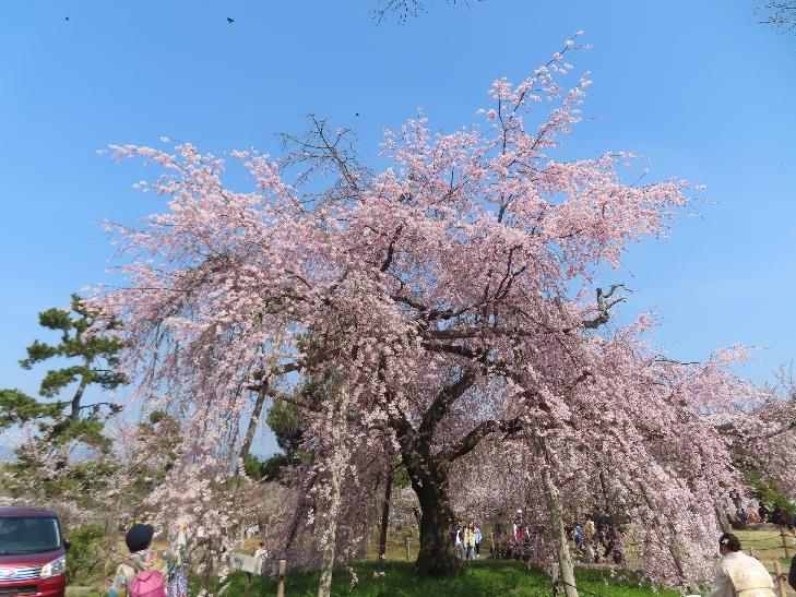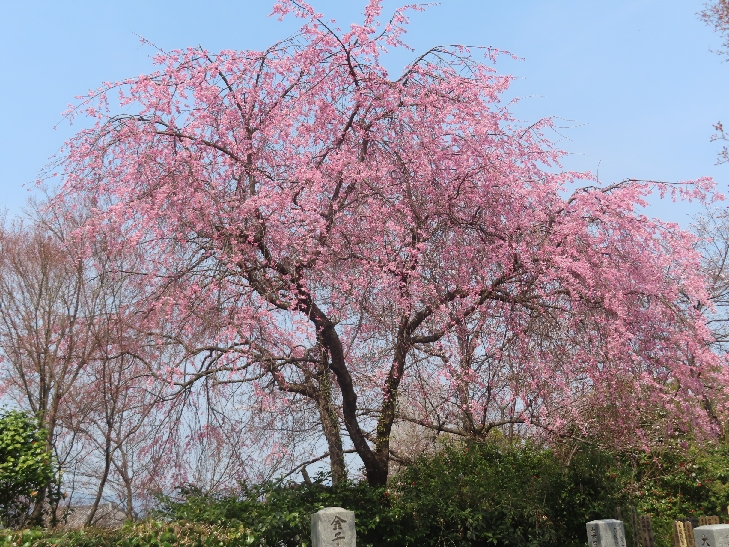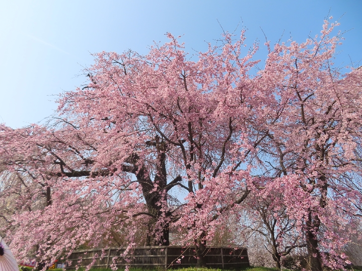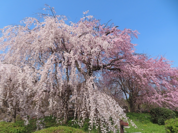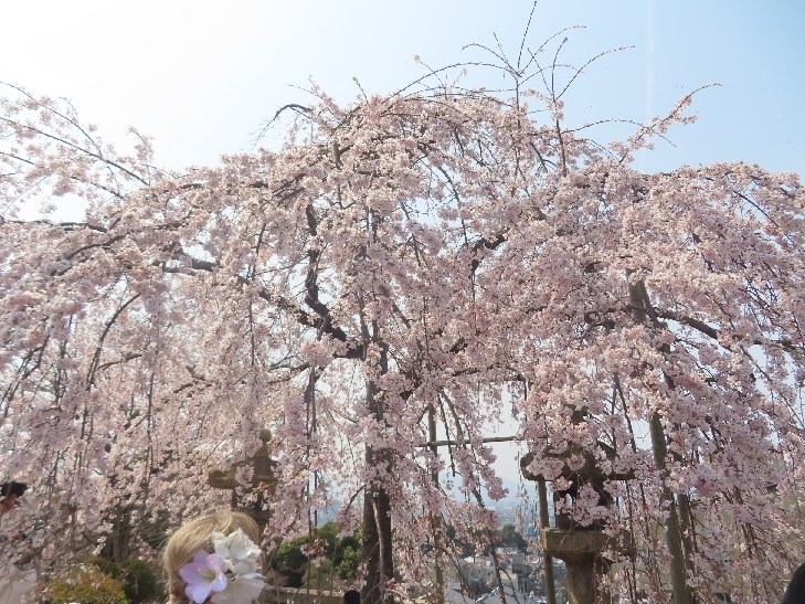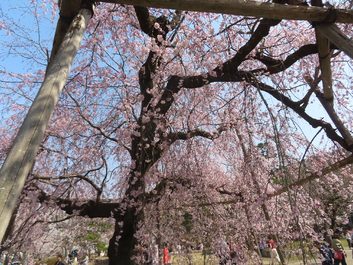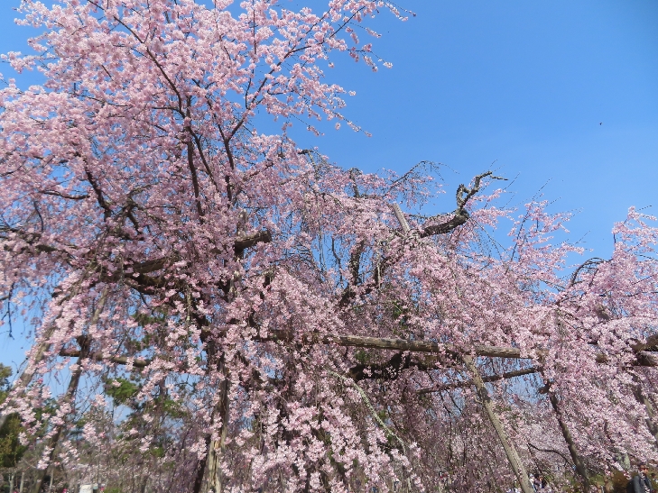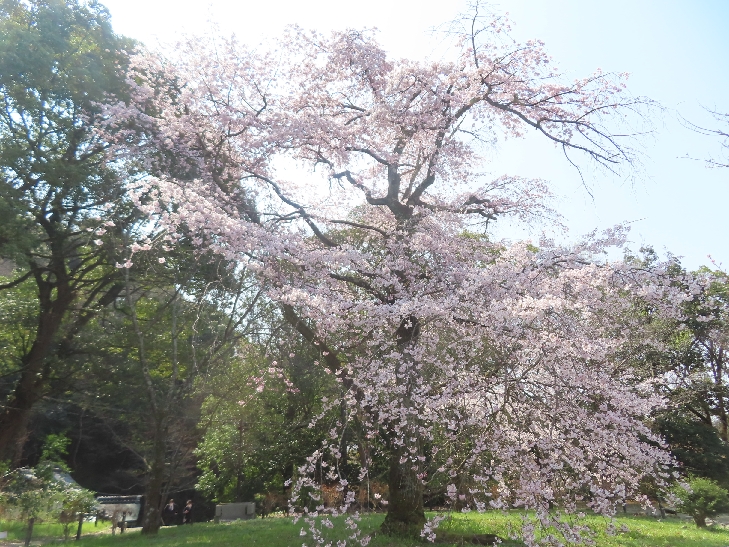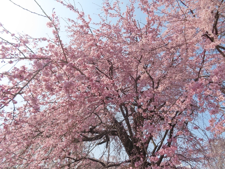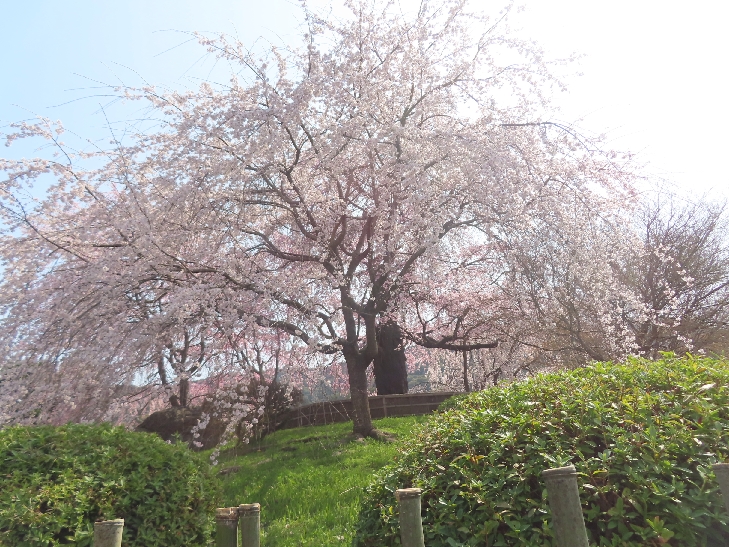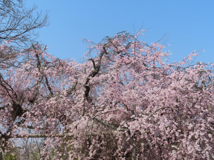樹齢90年ほどの祇園枝垂れ桜「一重白彼岸枝垂桜」が満開で空から降ってくるようで壮観です。