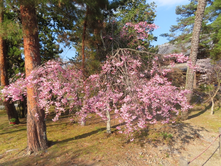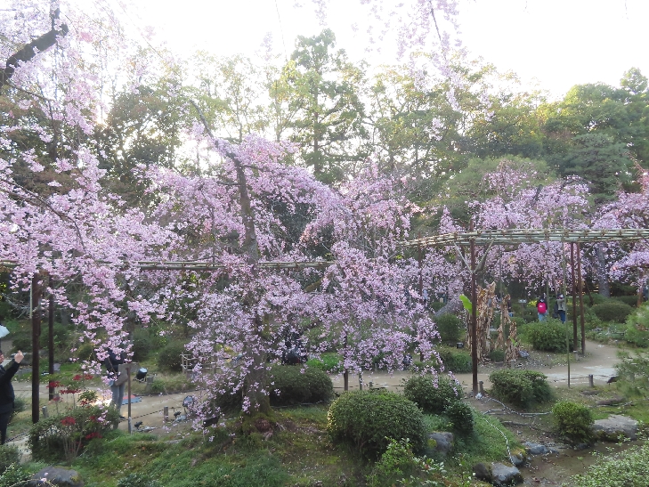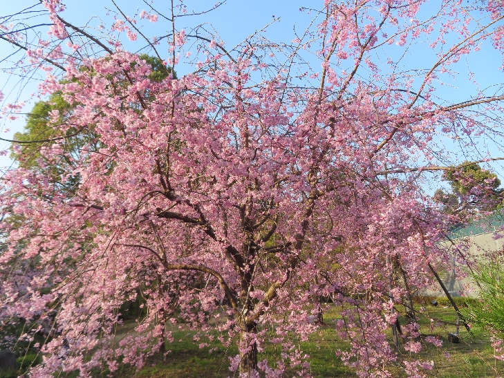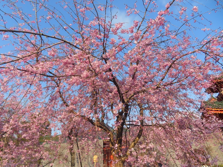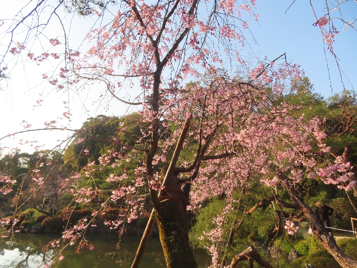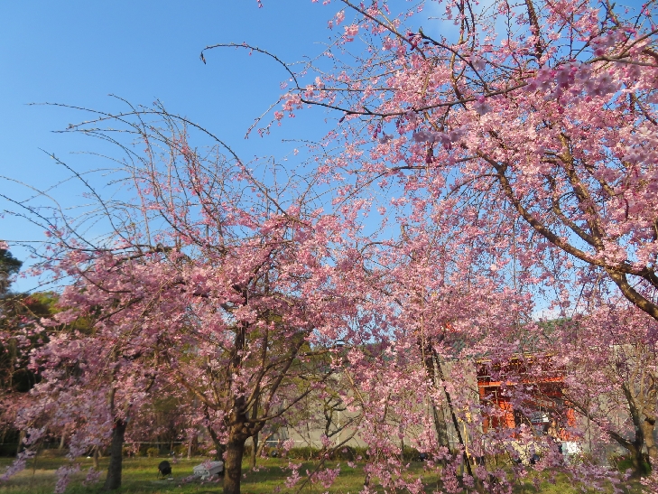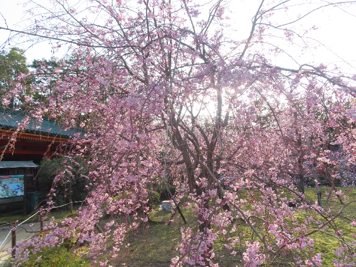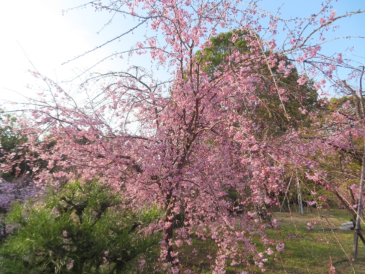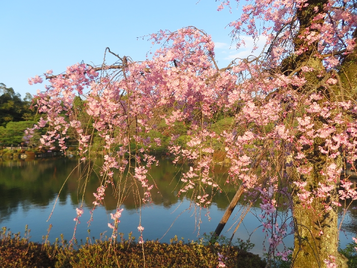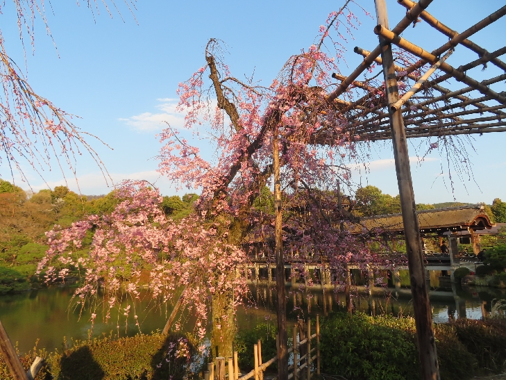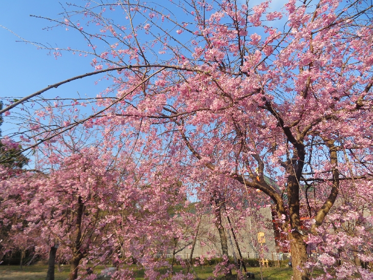 平安神宮の神苑に咲き誇る紅しだれ桜は、鮮やかで雅な感じがして和みます。
